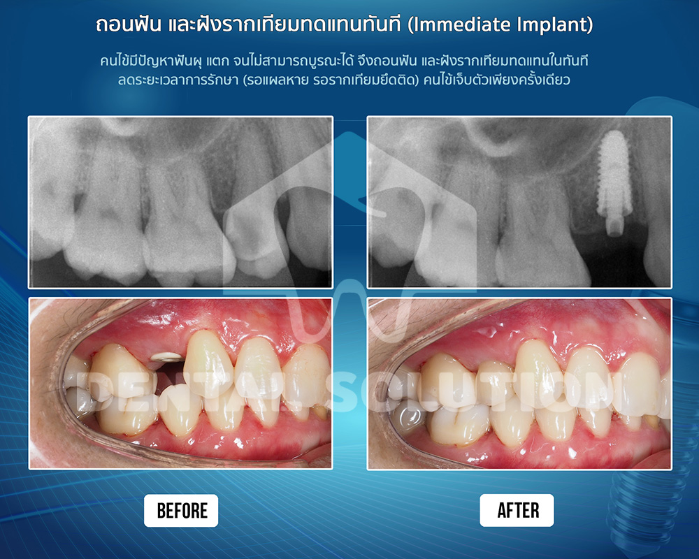 - การฝังรากฟันเทียมทดแทนทันที (Intermediate Implant) คือ การฝังรากฟันเทียมพร้อมกับการถอนฟัน (ถอนฟันแล้วฝังรากฟันเทียมแทนที่ในทันที) สามารถทำในบางเคสที่ไม่มีอาการอักเสบในบริเวณที่จะทำรากฟันเทียม ข้อดีคือคนไข้เจ็บตัวเพียงครั้งเดียว ลดระยะเวลาการรอคอยหลังการถอนฟัน ลดปัญหากระดูกละลายตัว