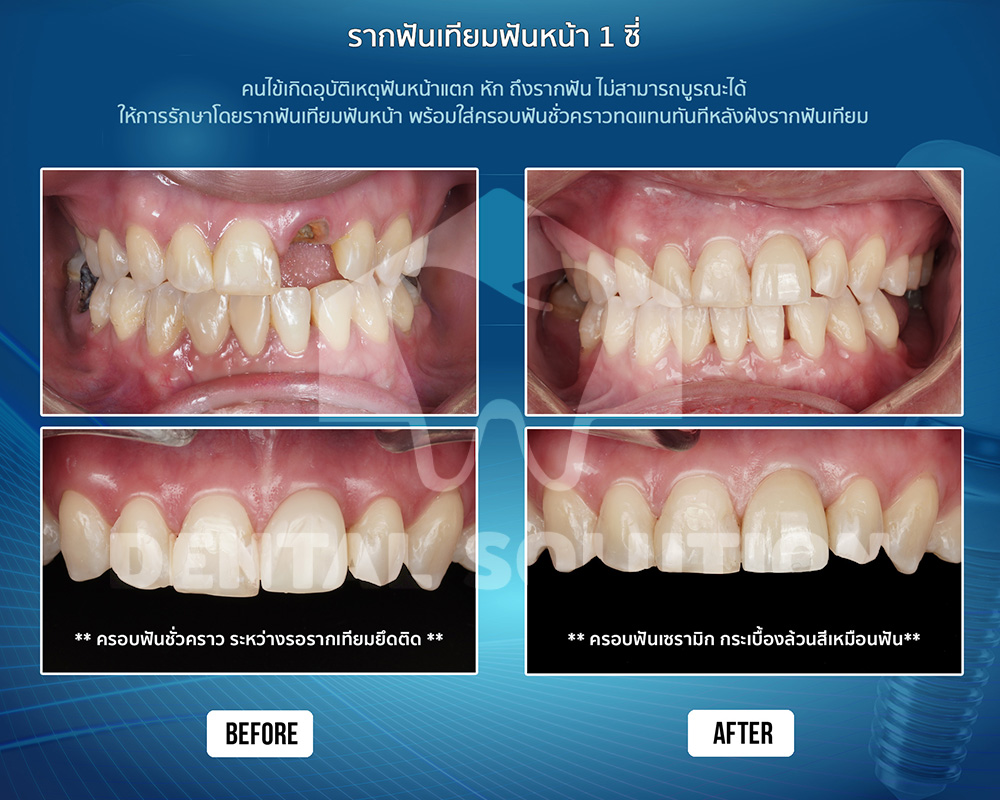 หากเป็นกรณีฟันหน้าสามารถปรึกษาคุณหมอเพื่อวางแผนใส่ฟันชั่วคราวพร้อมกับการทำรากฟันเทียมได้ โดยสามารถทำฟันชั่วคราวได้หลายวิธีขึ้นกับความเหมาสมในแต่ละเคส